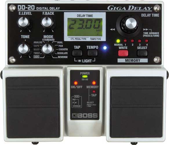 Every guitarist needs a delay pedal, period. And the Boss DD-20 is a PROFESSIONAL delay pedal, seriously. So if you're a delay head, or the kind of guitarist who doesn't want to settle for anything but the best. The Boss DD-20 is the twin-type Boss pedal you need in your rig. Dubbed the "Giga Delay," the DD-20 offers user memory so you can store up to four of your favorite delays and instantly recall them. That's cool. Set delay time with the knob or via tap tempo, whatever works best for you.