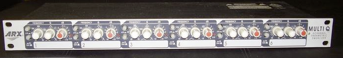 The Multi Q has six channels that each cover the complete audio spectrum, and each has its own Balanced Input and Output. Each channel also has controls for Frequency Select, with x 10 switch; Bandwidth, from three octaves through to 1/20th octave; Cut and Boost, up to + or -18 dB; and IN/OUT hardwire bypass switch. A clip LED indicates overload through all circuitry, and each channel has a numbered marker panel for easy confirmation of EQ assigns. The Multi Q’s exclusive and unique Internal patching system allows access to six channels of parametric EQ, either individually or in multiples.